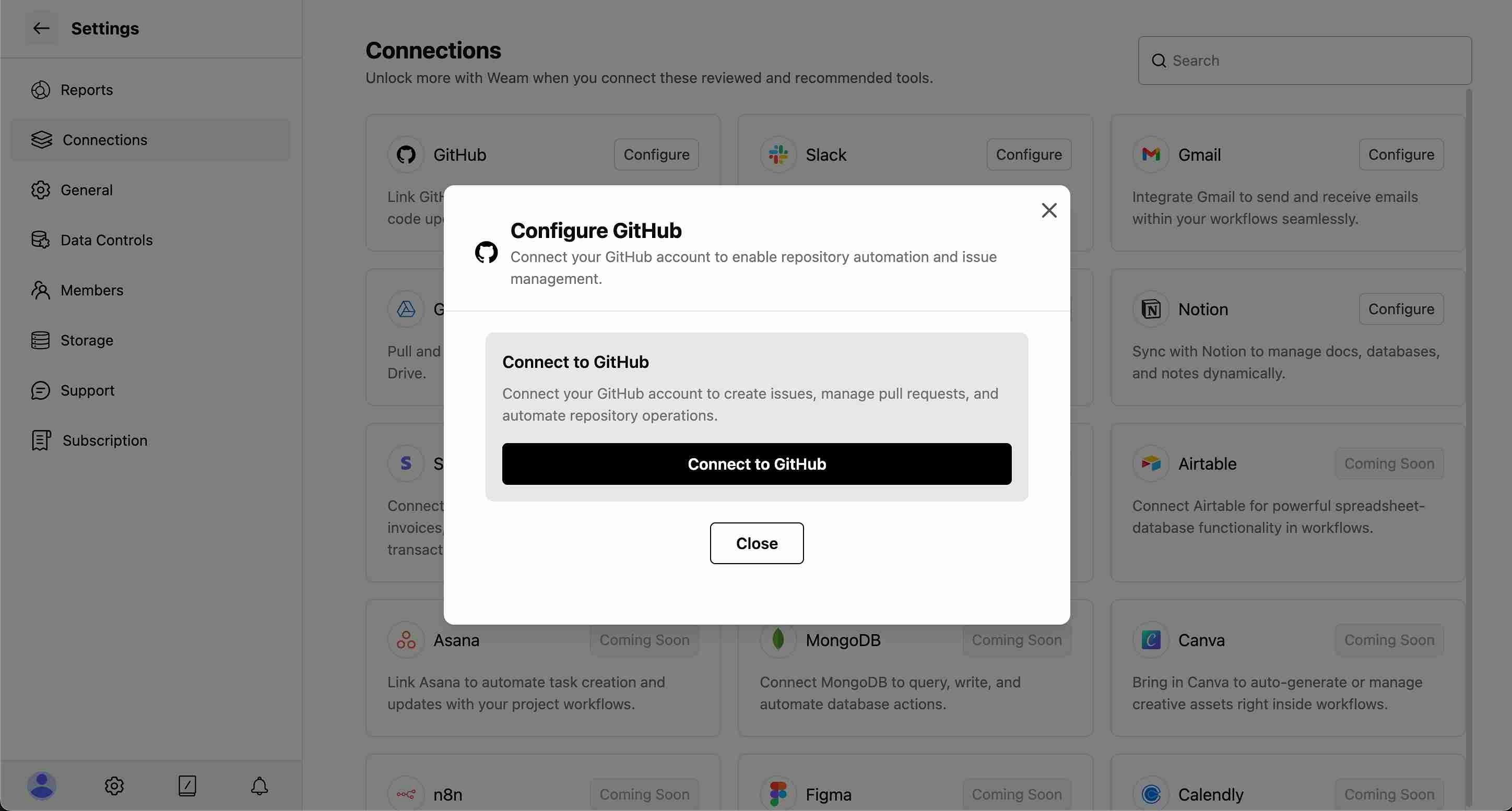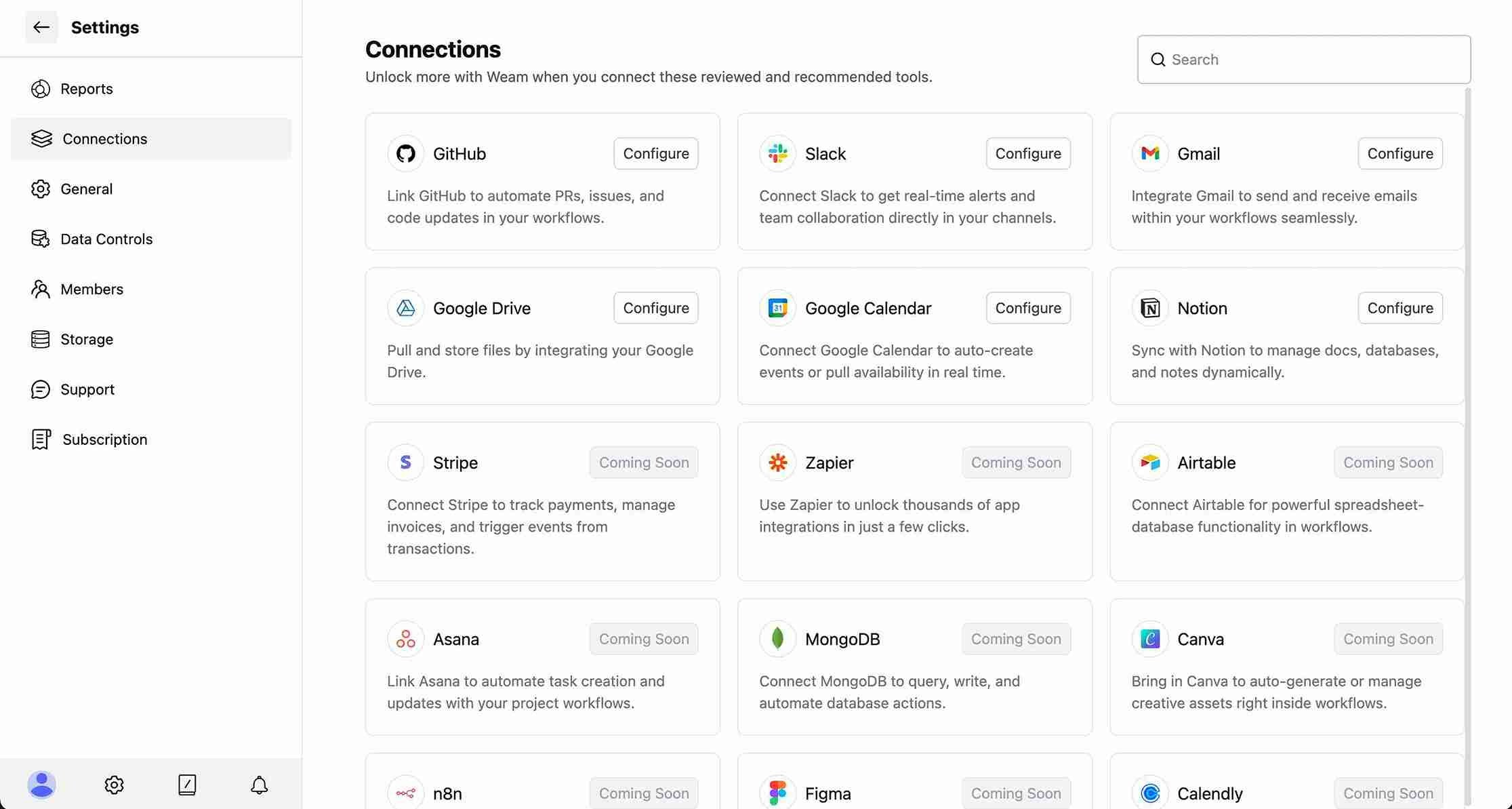 Connecting external services allows Weam AI to:- Access real-time data from your connected platforms
