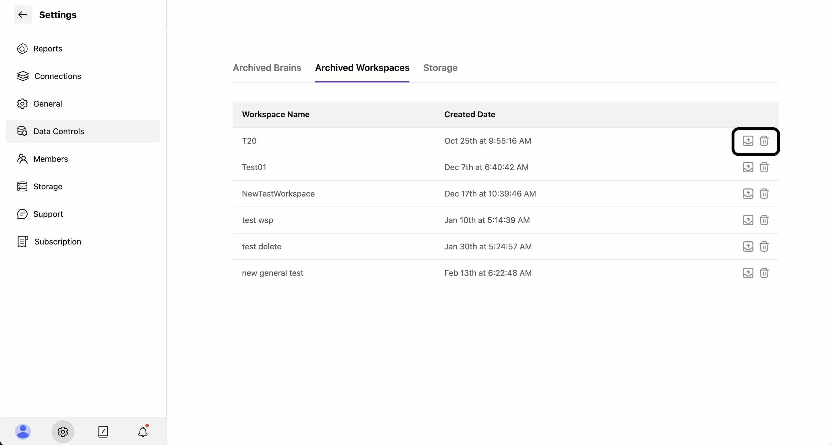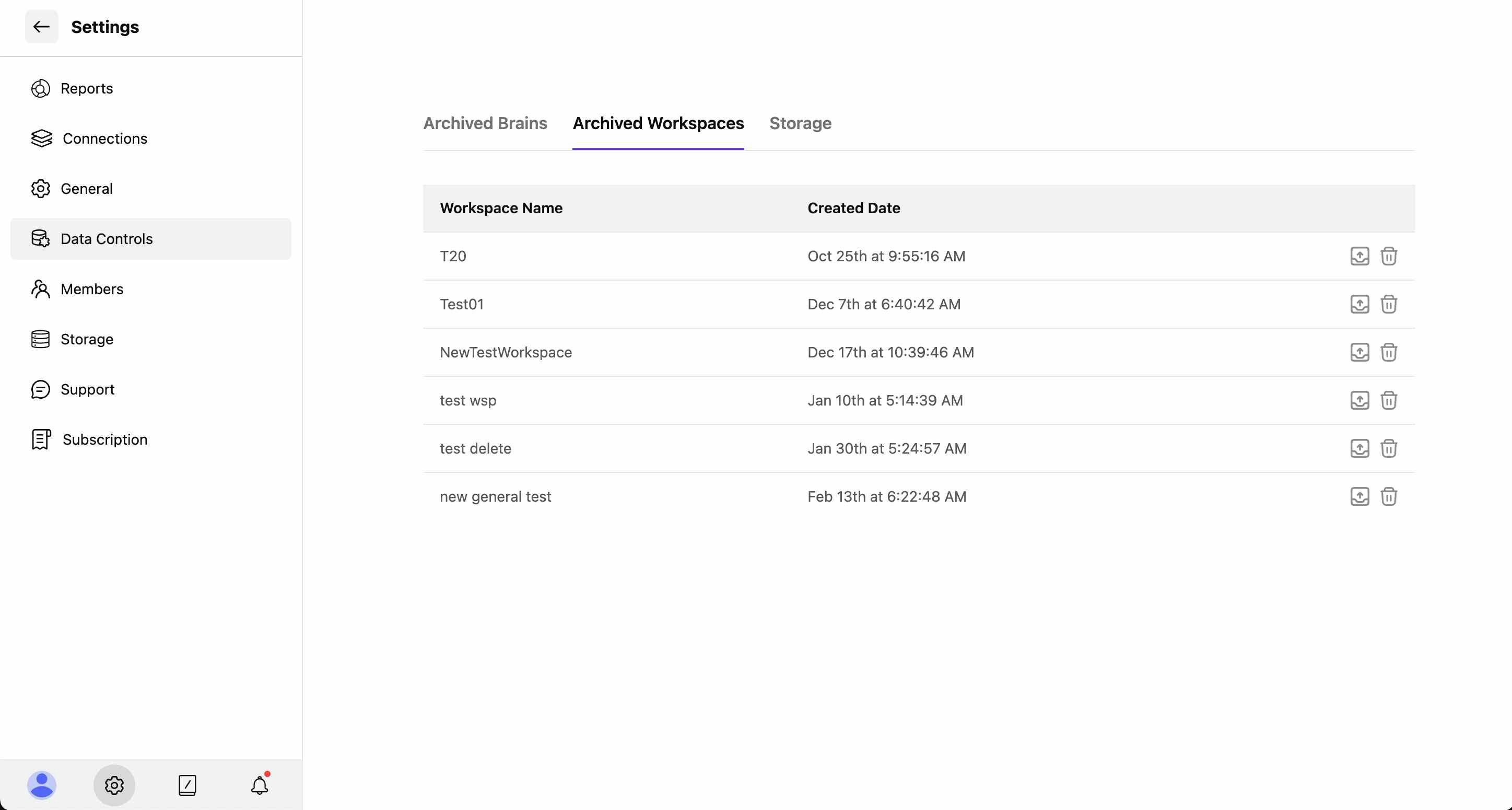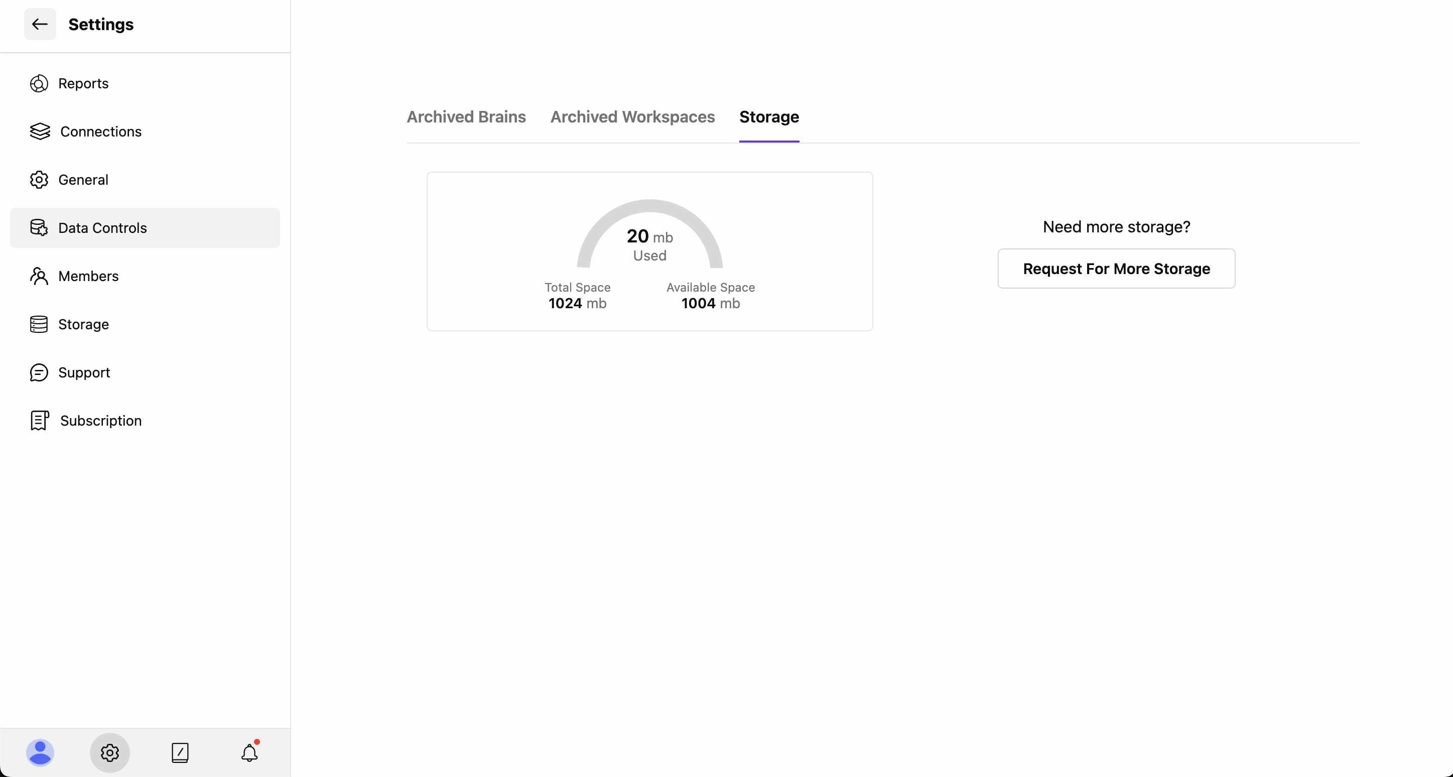 - Choose from three main sections: Archived Brains, Archived Workspaces, and Storage