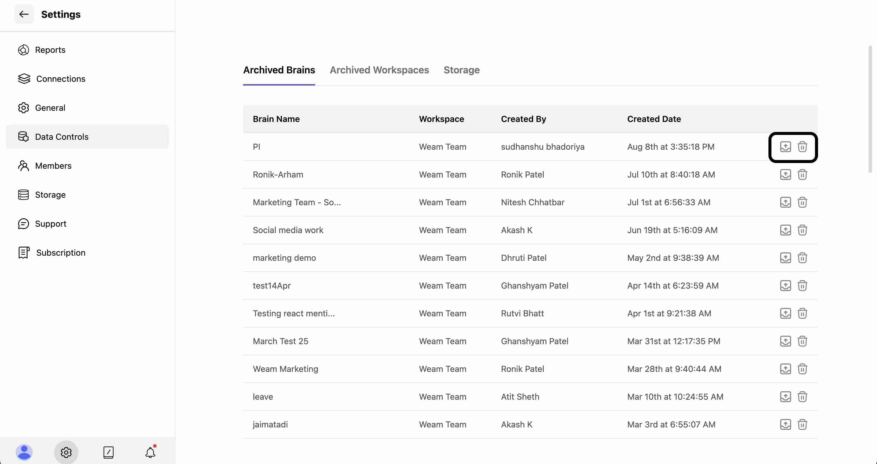 - Workspace: Which workspace the Brain belonged to (e.g., “Weam Team”)