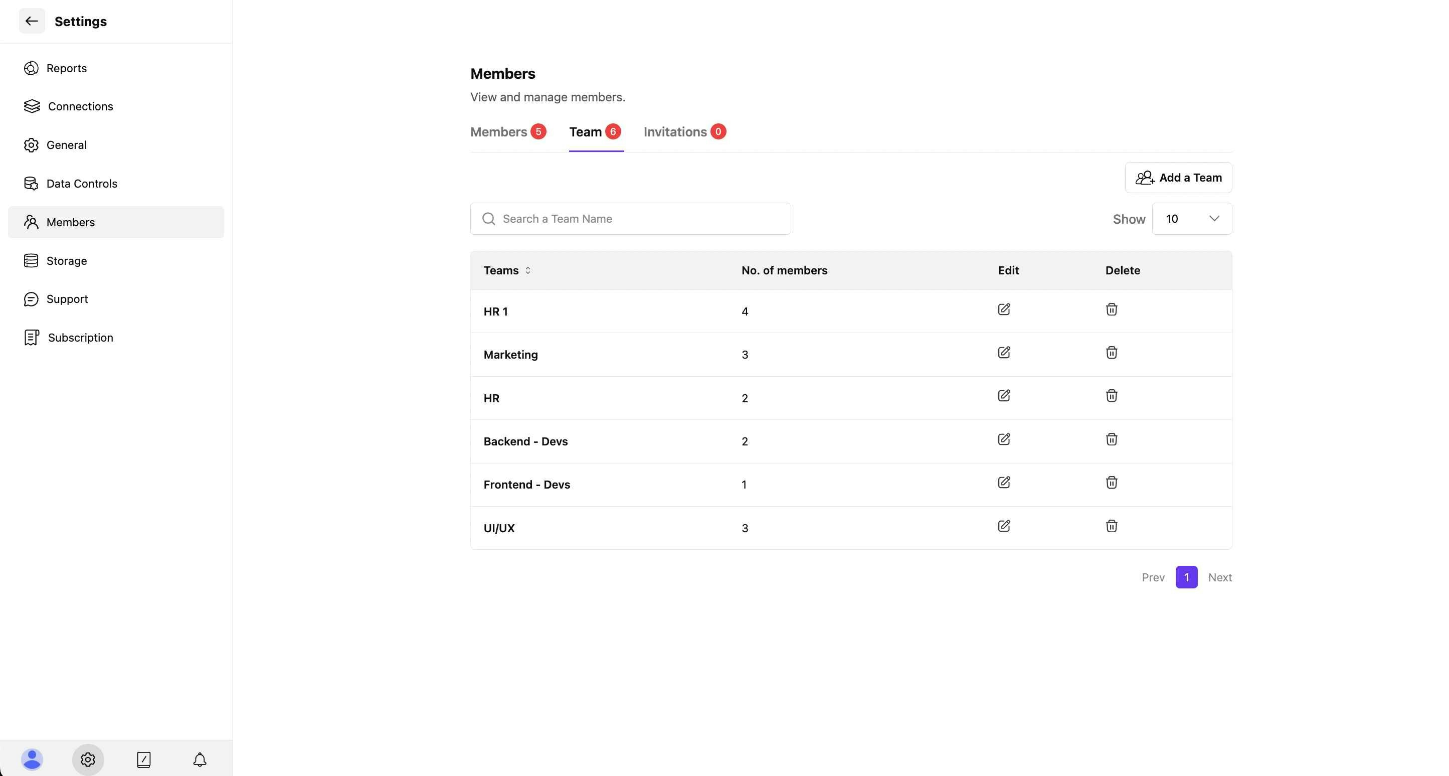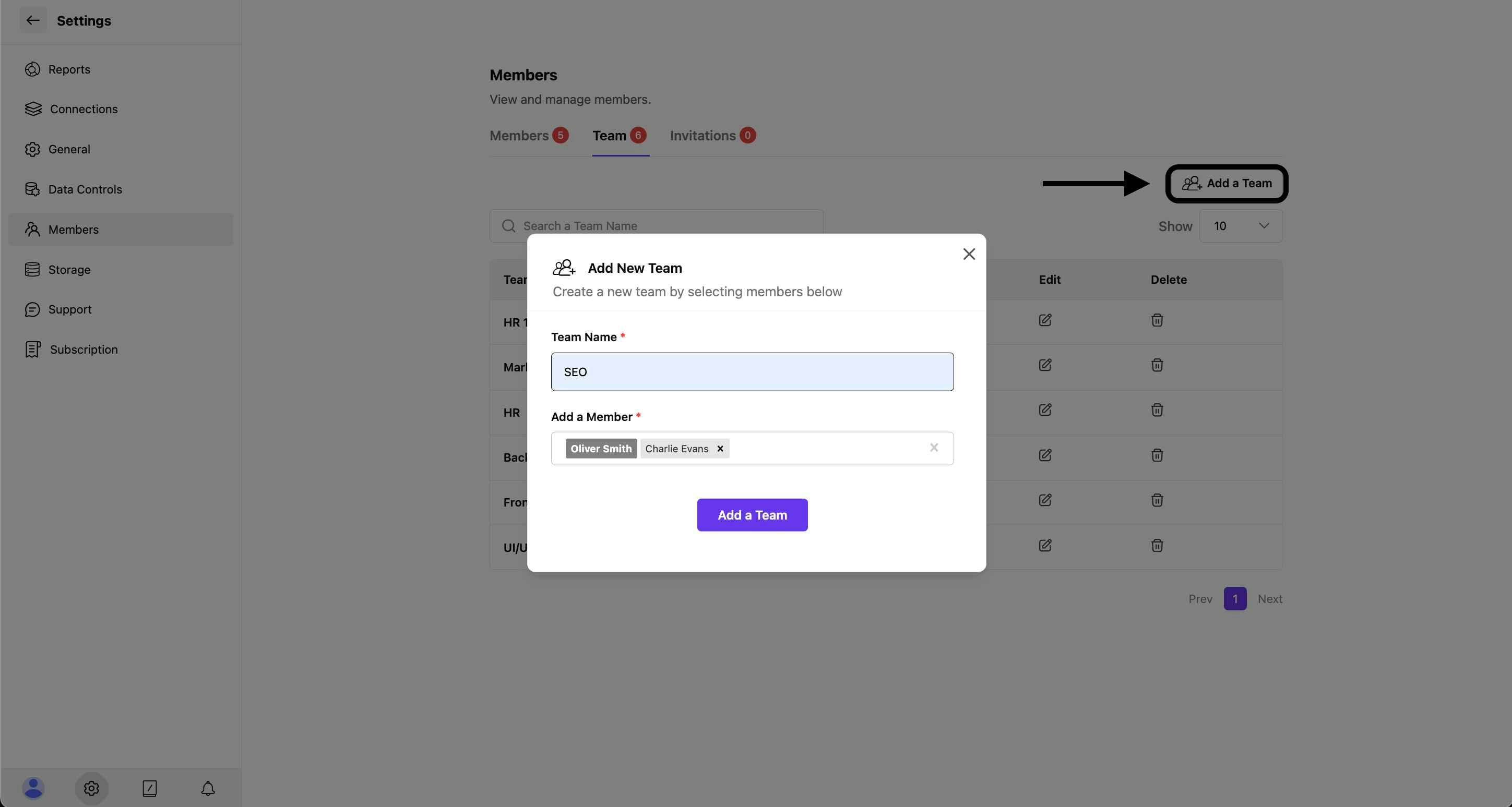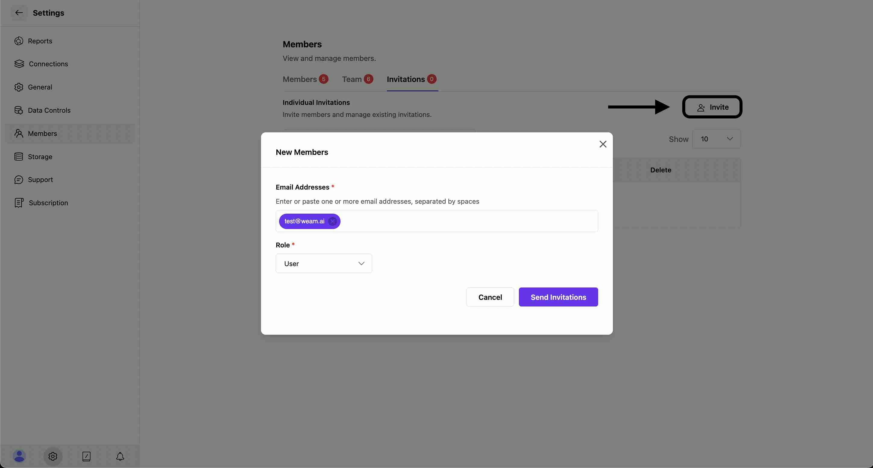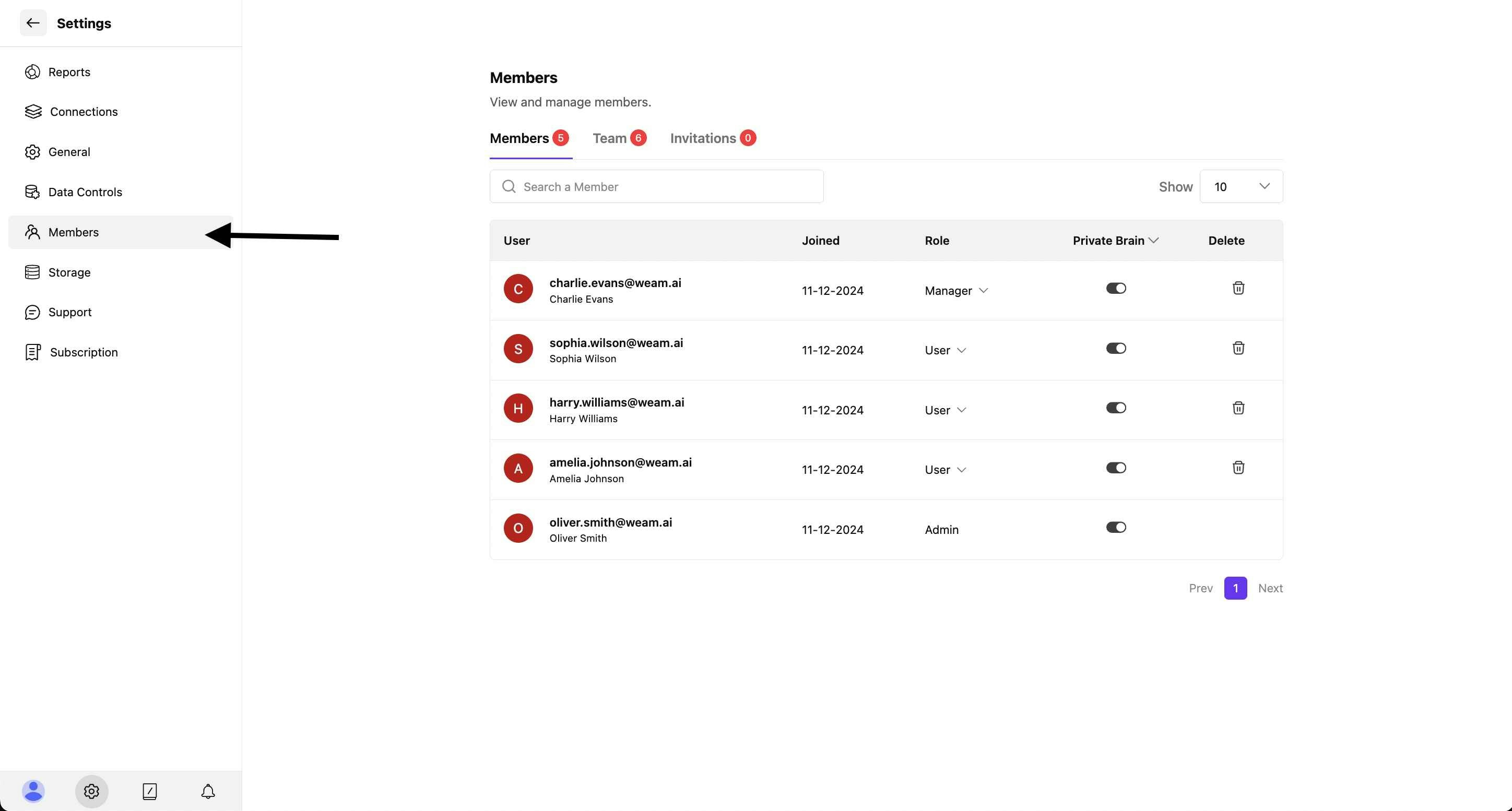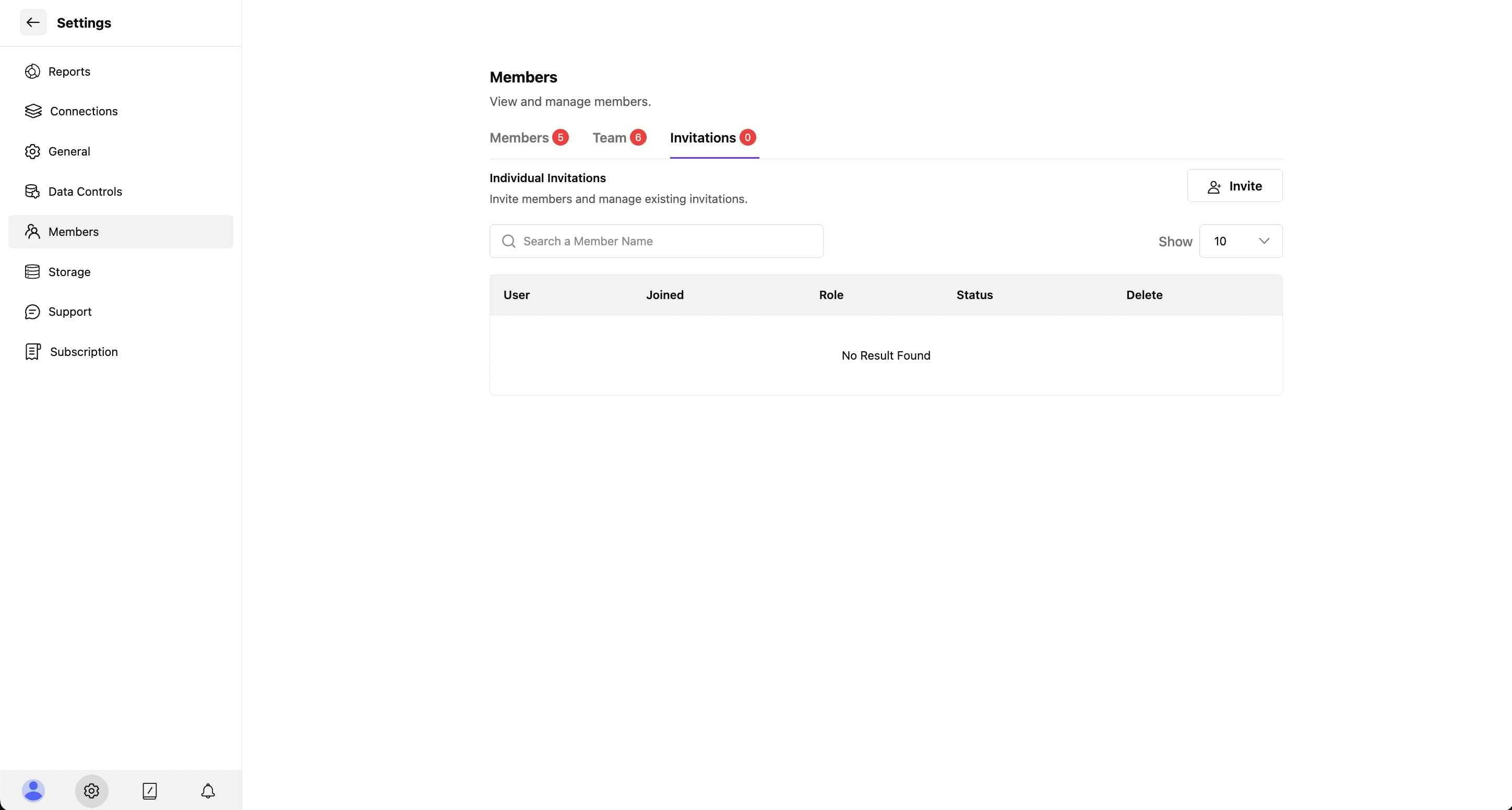 - The Members section provides three main tabs: Members, Team, and Invitations