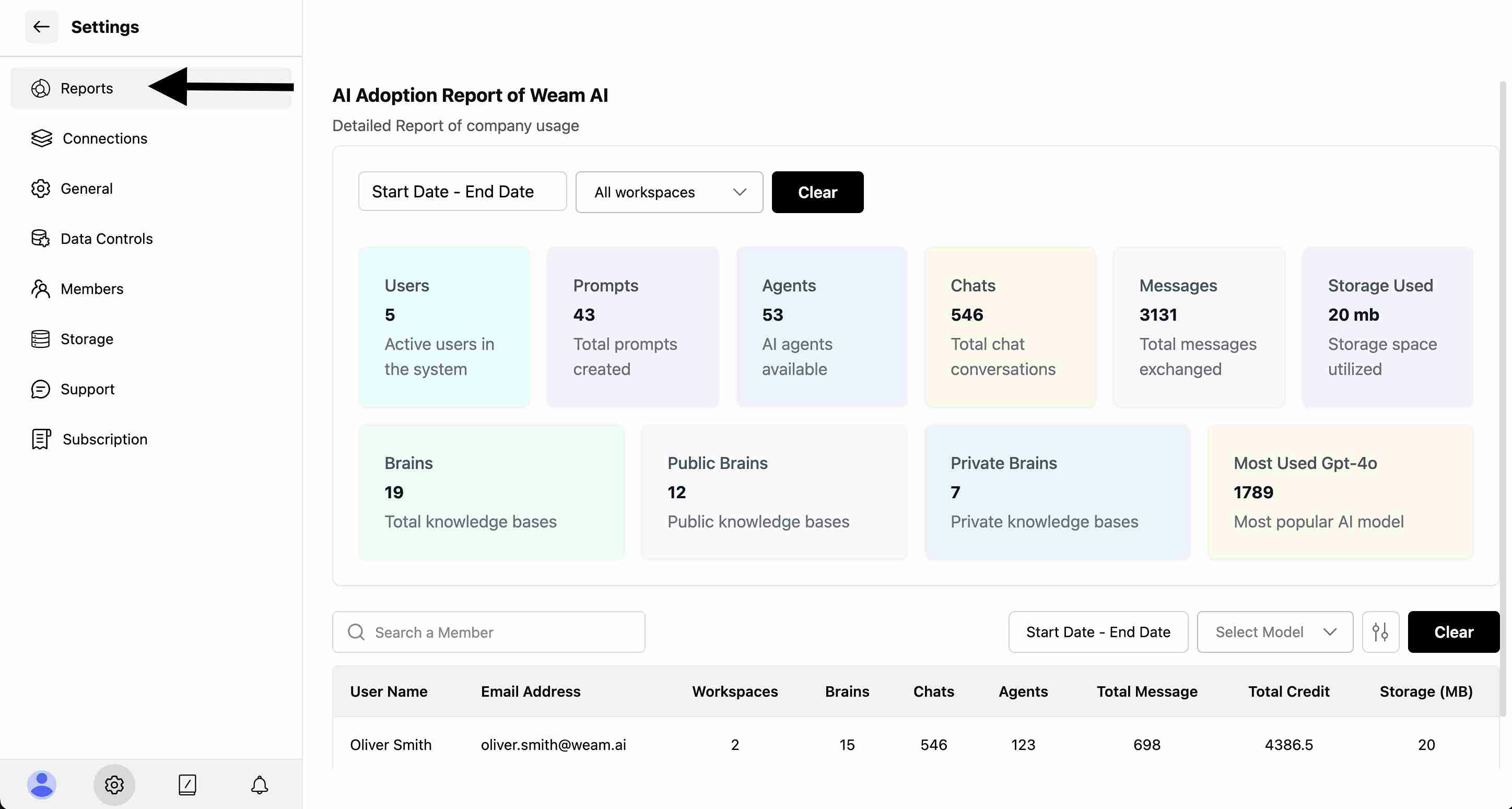 - View the “AI Adoption Report of Weam AI” with detailed company usage metrics