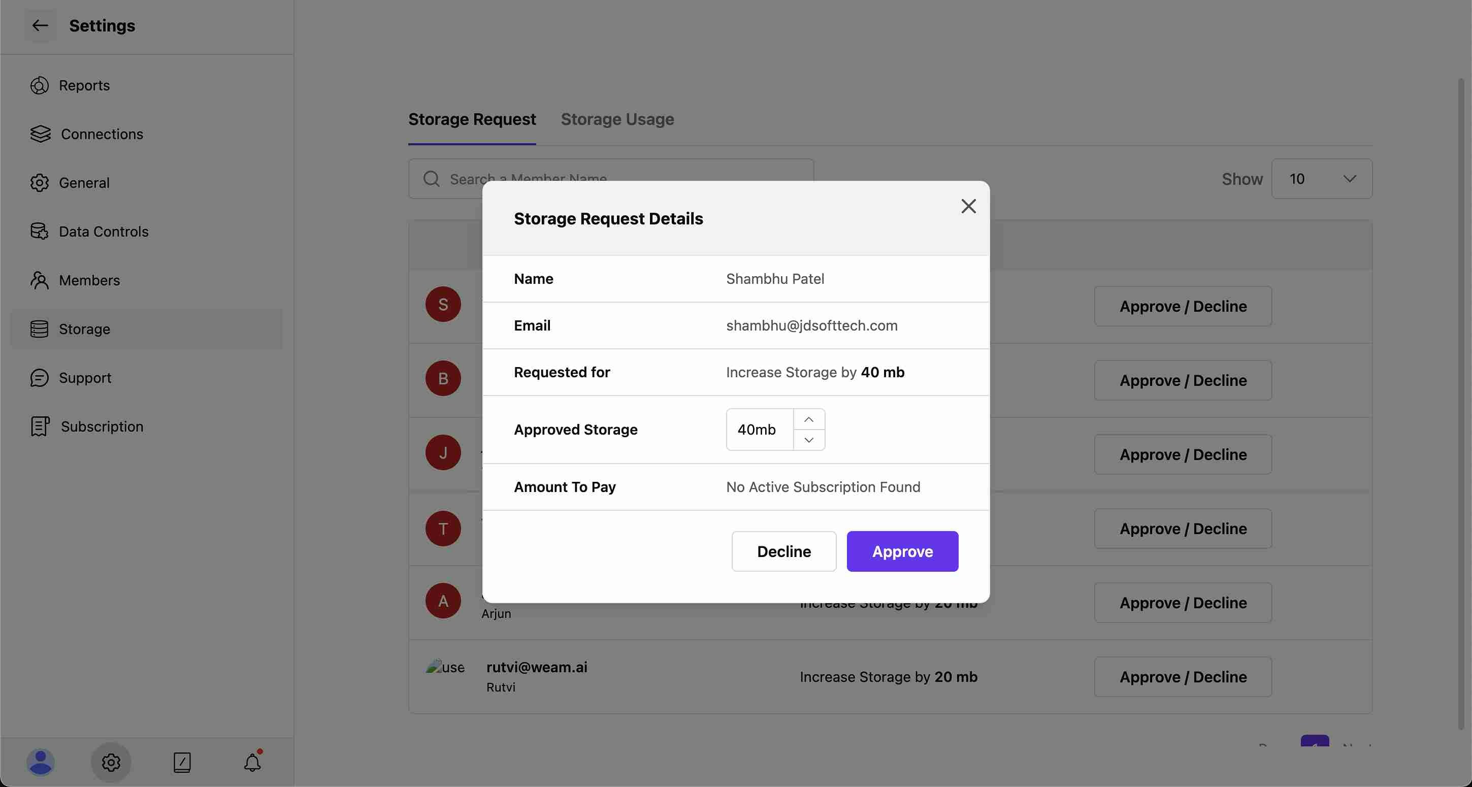 The Storage Request tab displays pending requests from team members who need additional storage allocation.Request Information