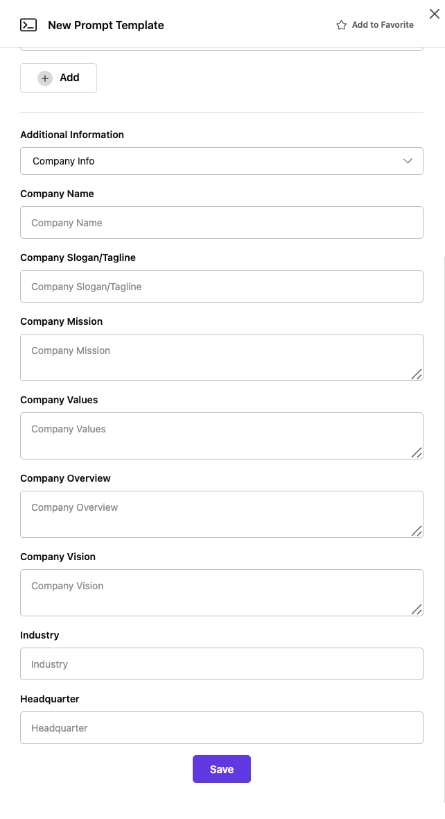 - Save Button: Complete prompt creation
