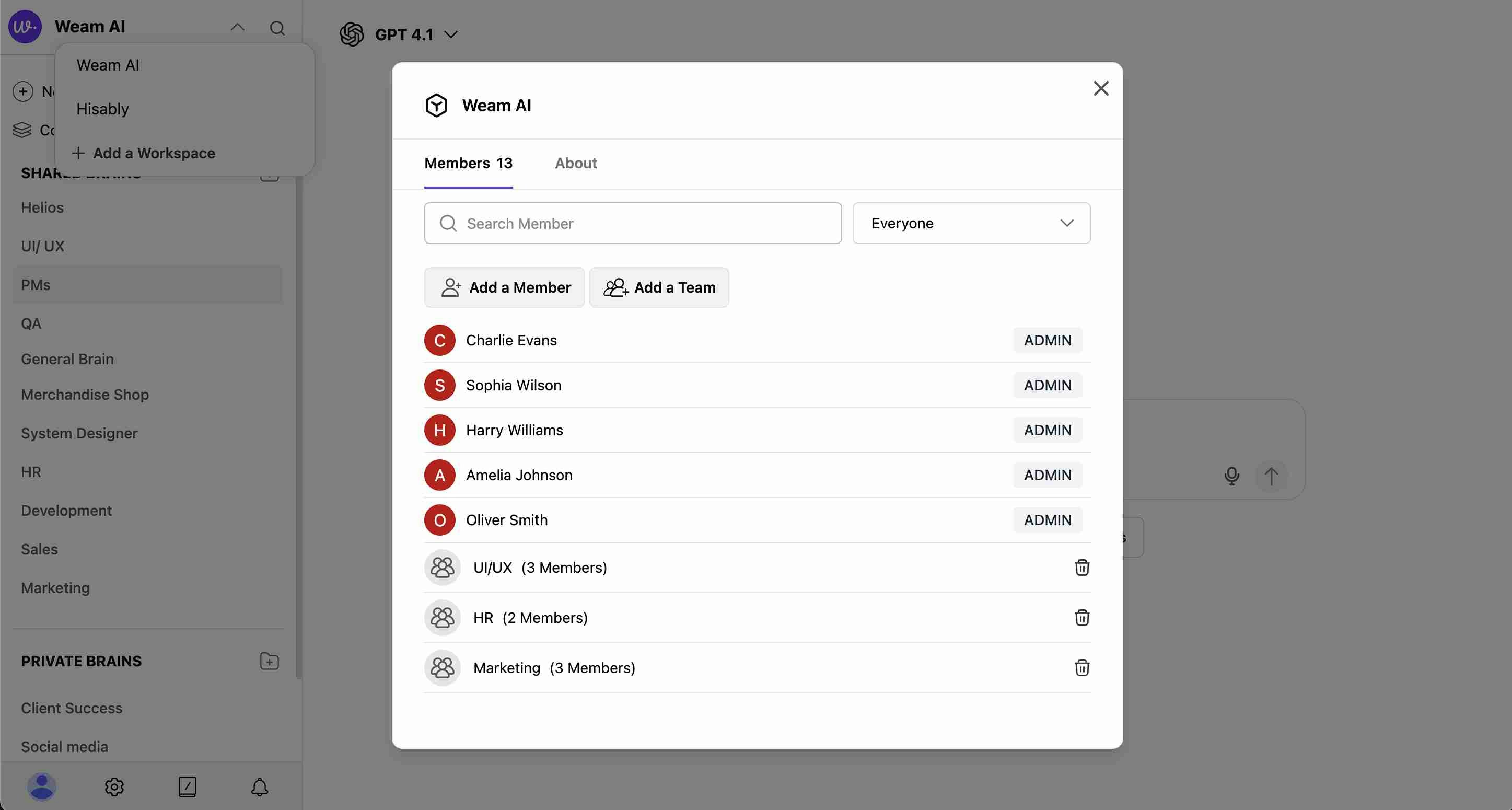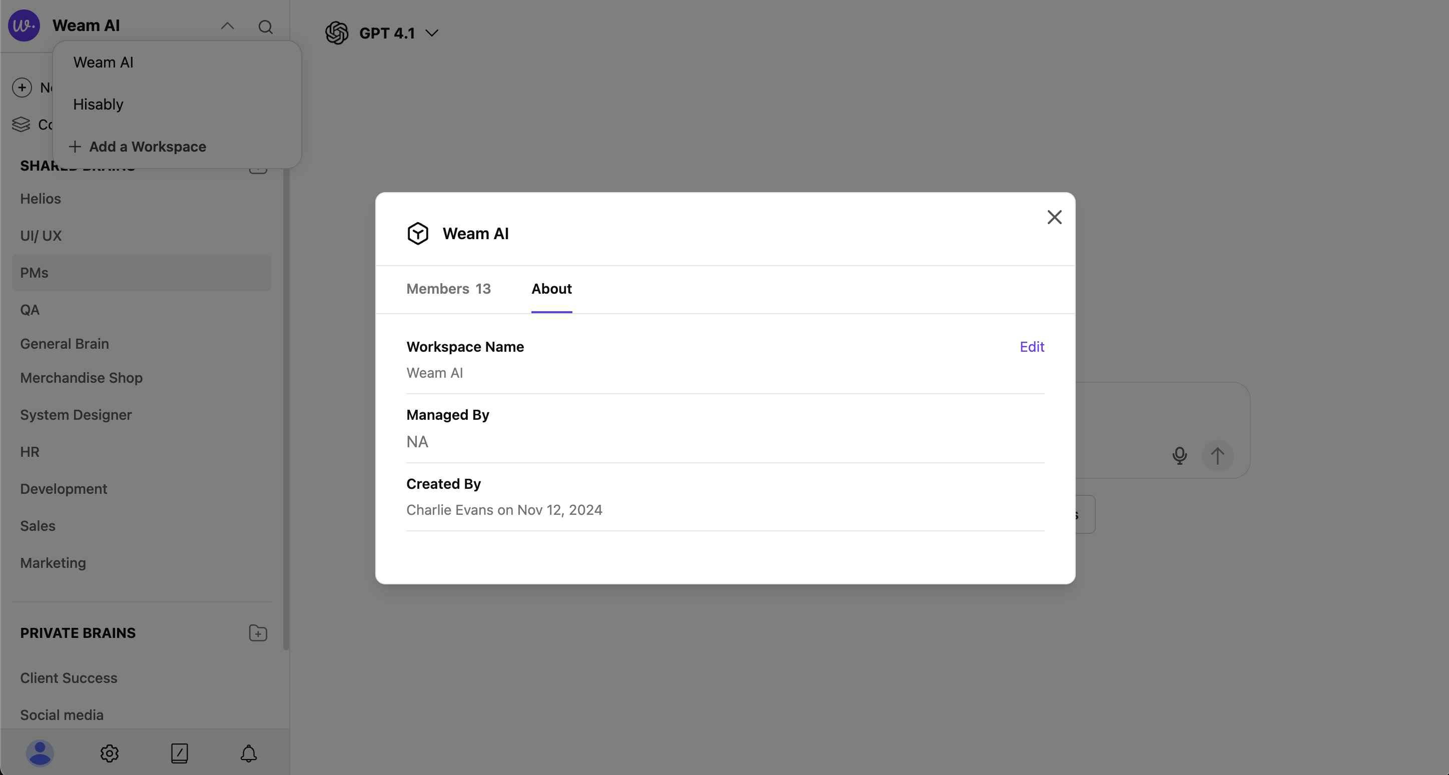 Access workspace information through the workspace modal: Members Tab- Total Count: Shows number of members (e.g., “Members 13”)