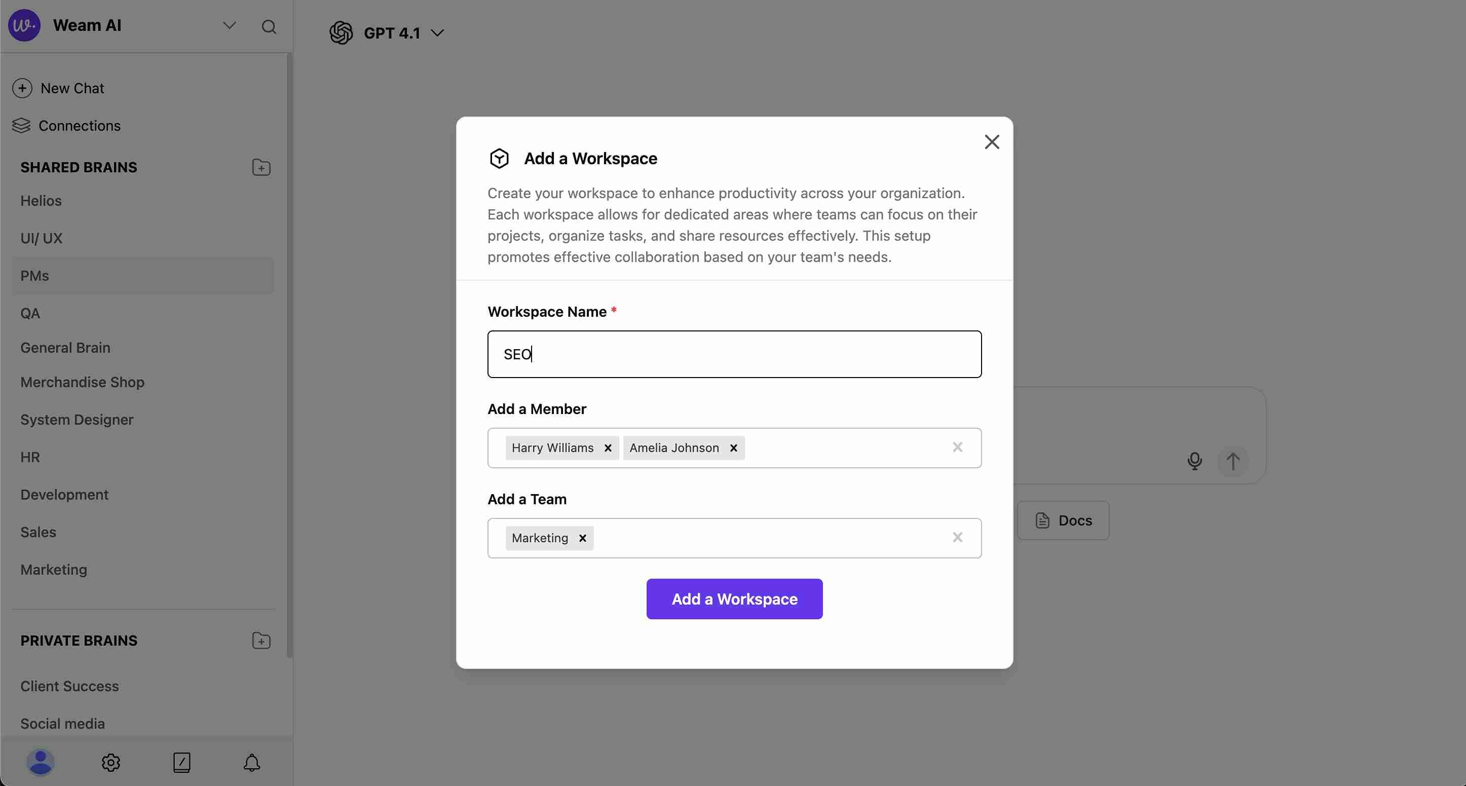 Each workspace maintains its own:- Brains: Knowledge bases specific to the workspace