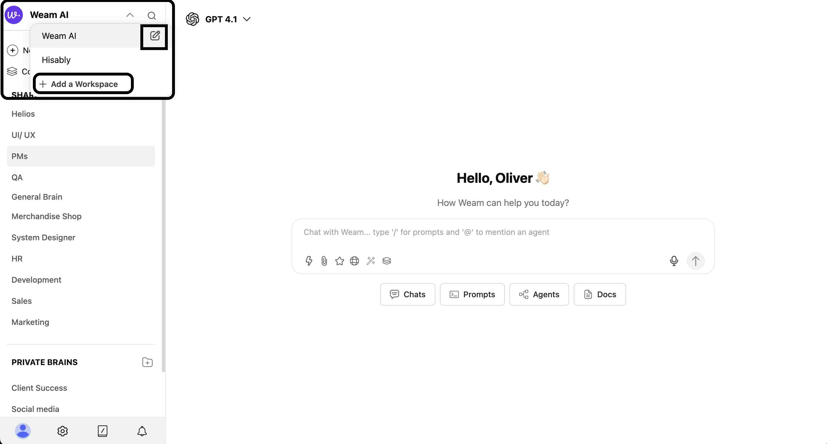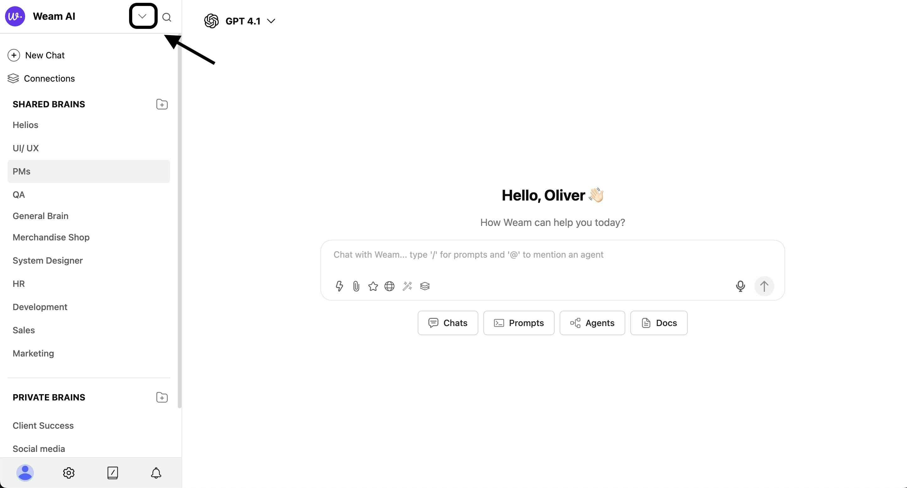 Your company workspace is automatically created upon first login, typically named after your organization (e.g., “Weam AI”).Accessing and Switching Workspaces